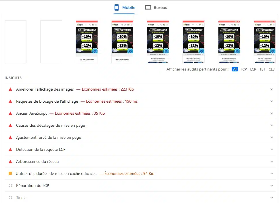 | LCP | Sur une fiche produit d’une boutique par exemple, si l’image s’affiche trop lentement, c’est un frein majeur à l’expérience utilisateur. Identifiez-le en allant dans le rapport détaillé “Insights”. Dans la majorité des cas, il s’agit d’une image trop lourde. | Il est possible d’optimiser le chargement de l’élèment LCP. ⚠️ Le lazyloading ou chargement différé ne doit pas s’appliquer à cet élèment. |