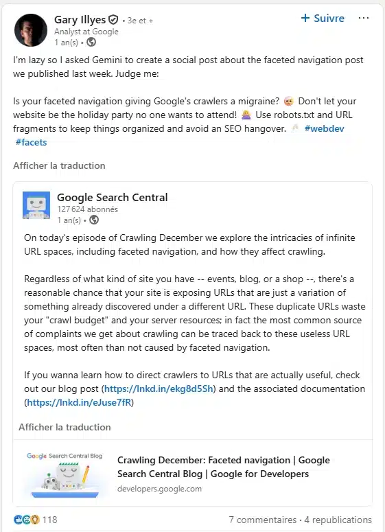 Sur un site e-commerce Prestashop ou Magento, il n’est pas rare de voir 50 000 URLs de filtres aspirer la totalité du budget sans jamais générer un euro de trafic. Selon Google lui-même, la navigation à facettes est responsable de près de la moitié de tous les problèmes de crawl signalés en 2025. Un mal confirmé par Gary Illyes, analyste chez Google dans son post Linkedin :