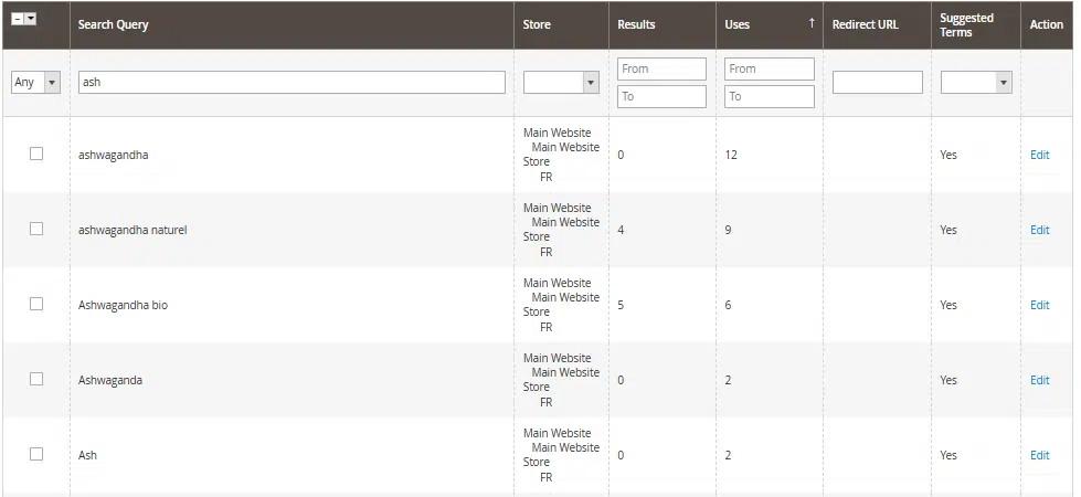L’analyse des “search terms” dans magento va vous permettre d’identifier les termes, les mots clefs les expressions etc qui sont sasies par vos prospects et clients dans votre moteur de recherche interne. Cet écran est particulièrement intéressant car il permet de faire correspondre les termes utilisés à tord par les prospects et les empechant potentiellement de trouver le bon résultat. L’erreur qu’ils commetent peut aller de la simple faute d’orthographe sur un terme complex à la méconaissance d’un produit.