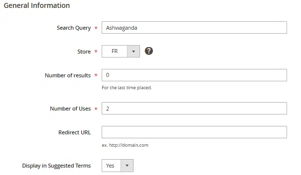 Là ou les synonymes gérés par groupes permettent de faire correspondre différentes orthographes à un seul et même terme, la gestion des termes de recherche permet elle de potentiellement renvoyer une recherche vers une url précise, ça peut être un article de blog, un une page catégorie ou une fiche produit ou encre une url de recherche spécifique préfiltrée par exemple.