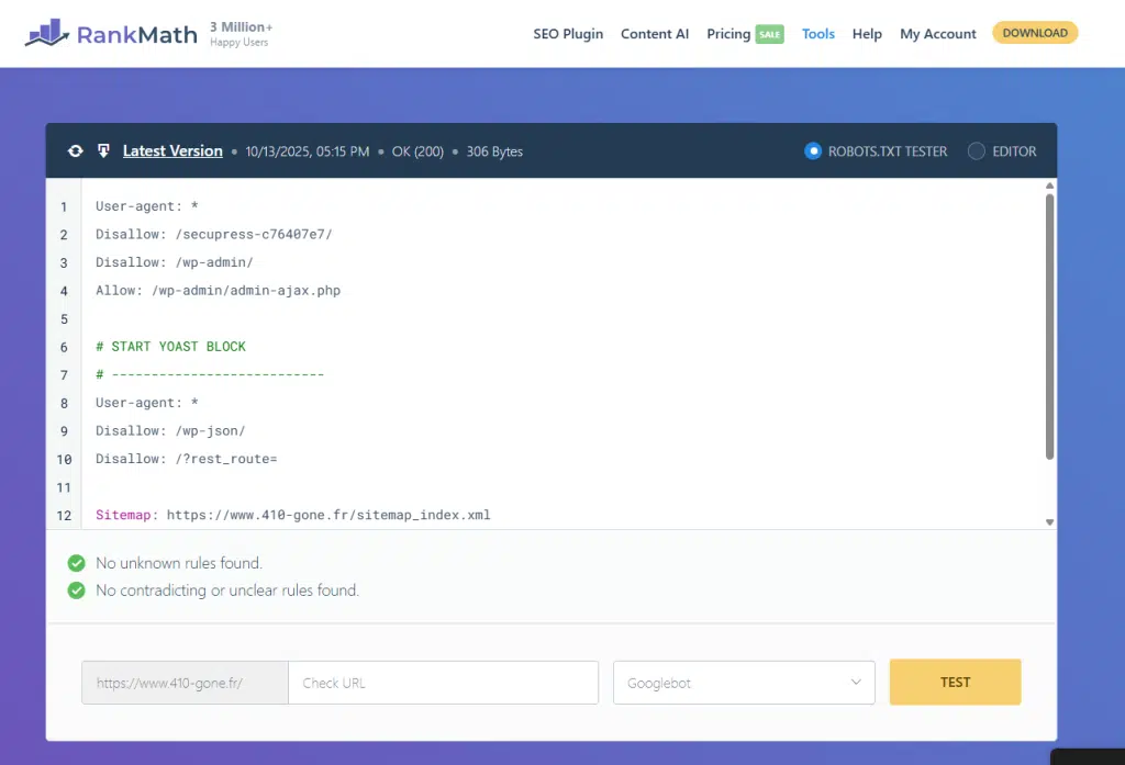 🛠️ Les solutions : à l’instar de l’outil de RankMath, il existe certains outils permettant de vérifier la présence d’erreurs ou règles contre-productives pour le SEO. Mais vous pouvez également demander à ChatGPT de vérifier la syntaxe ou d’optimiser votre fichier pour Google !