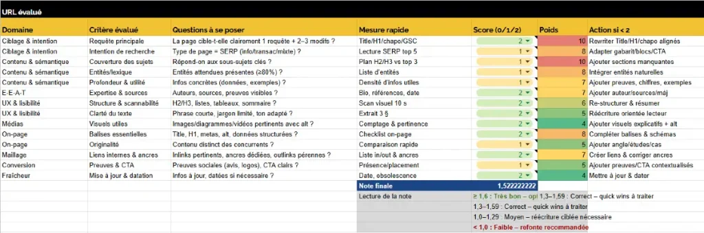 Et pour votre stratégie, Google vous invite à auto-évaluer votre contenu autour du prisme de l’EEAT. L’objectif : vous aider à comprendre pourquoi votre contenu est moins bon que les autres. Au sein de notre agence SEO, nous avons crée une métholodogie d’évaluation basée sur les critères suggérés par Google dans sa documentation officielle :