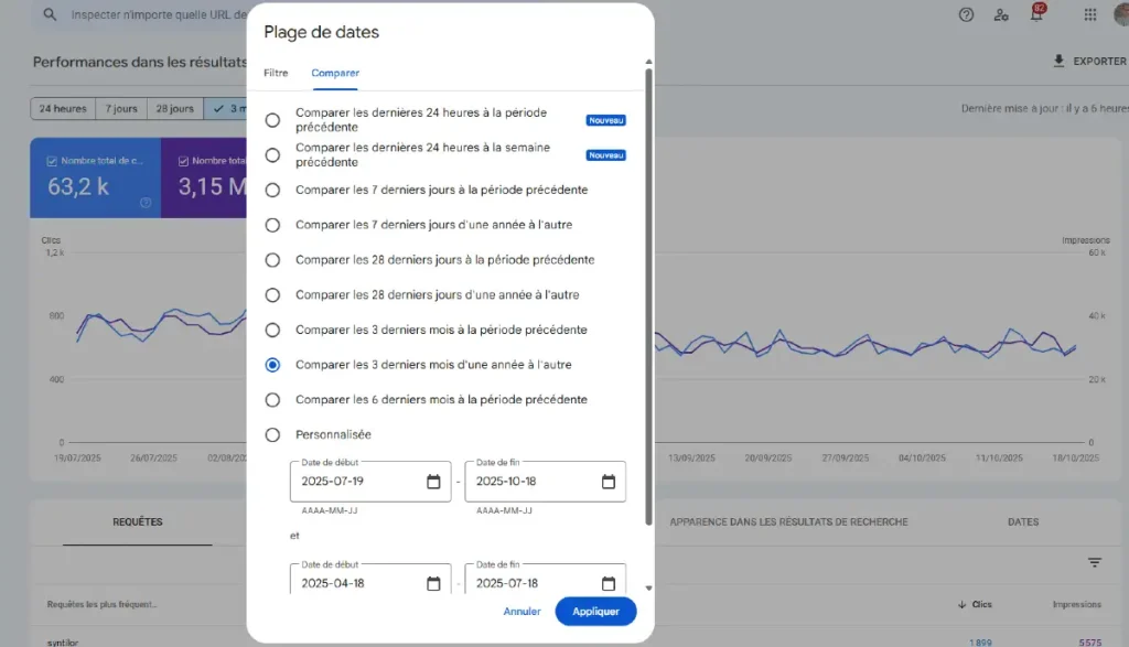 Rendez-vous donc dans le rapport “Performances” de la GSC puis sélectionnez deux plages de dates.