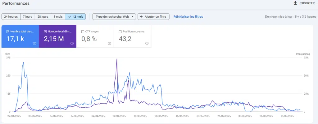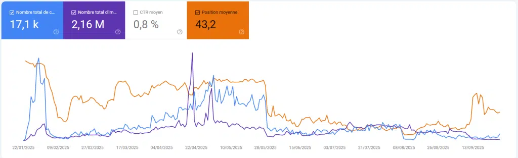 Dans le cas présent, la chute brutale des positions, accompagnée d’une chute des clics, prouve clairement que le site a été impacté négativement par les algorithmes de classement.