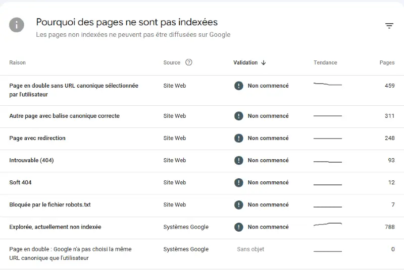Pour écarter rapidement une erreur technique, consulter le rapport Indexation > Indexation des pages de votre propriété Search Console.