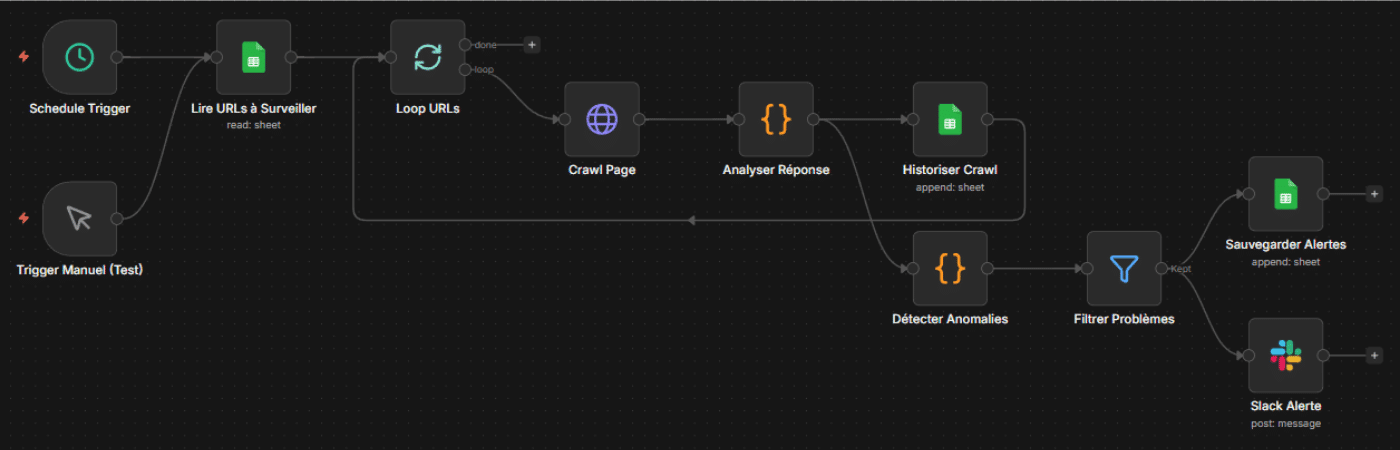 Ces workflows combinent plusieurs sources de données, du code JavaScript, et des logiques conditionnelles. C’est là que n8n révèle tout son potentiel pour le SEO e-commerce.