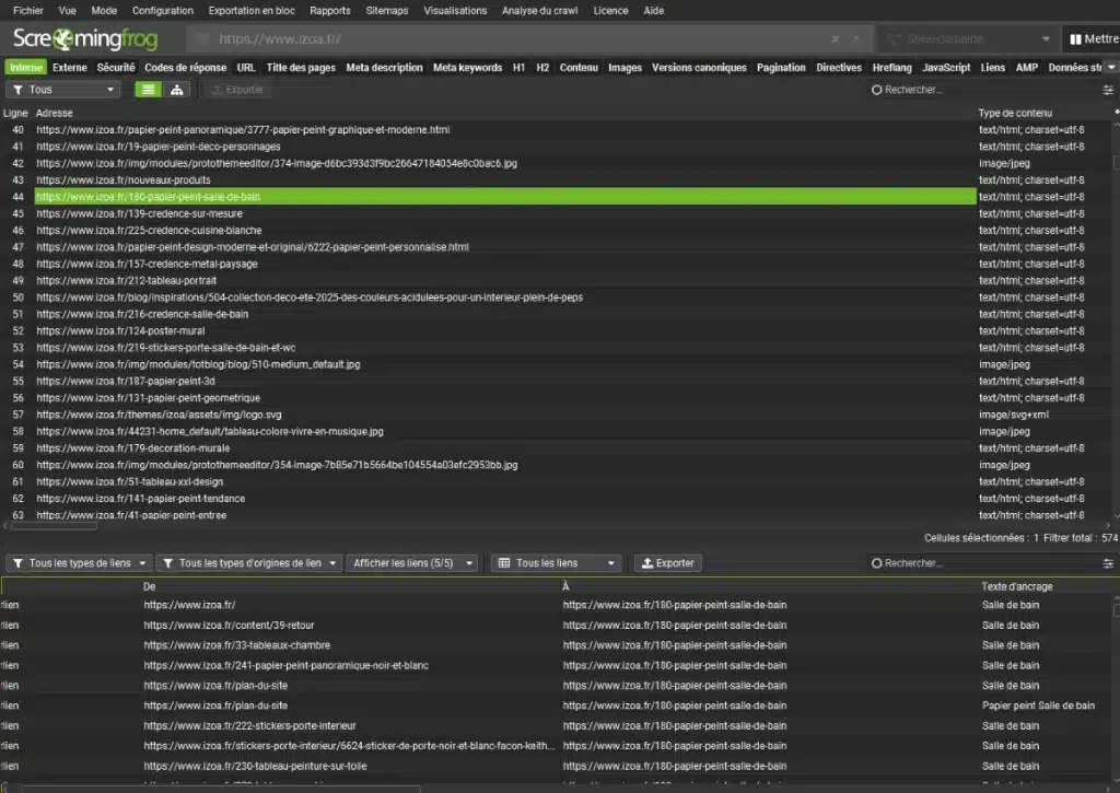 ℹ️ Analyser facilement les ancres de lien interne avec Screaming Frog: ce crawler est l’outil le plus simple et le plus puissant pour analyser tous les problèmes cités ci-dessus ! Vous pourrez notamment voir tous les “texte d’ancrage” utilisés dans des liens internes pour une page donnée. Il vous suffit de cliquer sur un url dans l’onglet “Interne” puis de sélectionner l’onglet du bas “Liens entrants”.