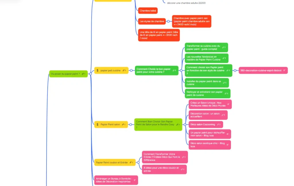 Pour cet exercice, l’utilisation d’un outil de mindmapping est le plus efficace ! Commencez par regrouper, classer les pages existantes par thématique. Dans l’exemple suivant, un consultant SEO 410 Gone a classé des contenus pour une boutique vendant des papiers peints.