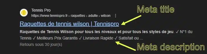 Un title optimisé doit contenir vos mots-clés principaux (5 maximum). La présence de ces termes permet à Google de comprendre votre commerce. Pour une structure parfaite il faut placer le mot clé le plus important au début et les moins importants à la fin.